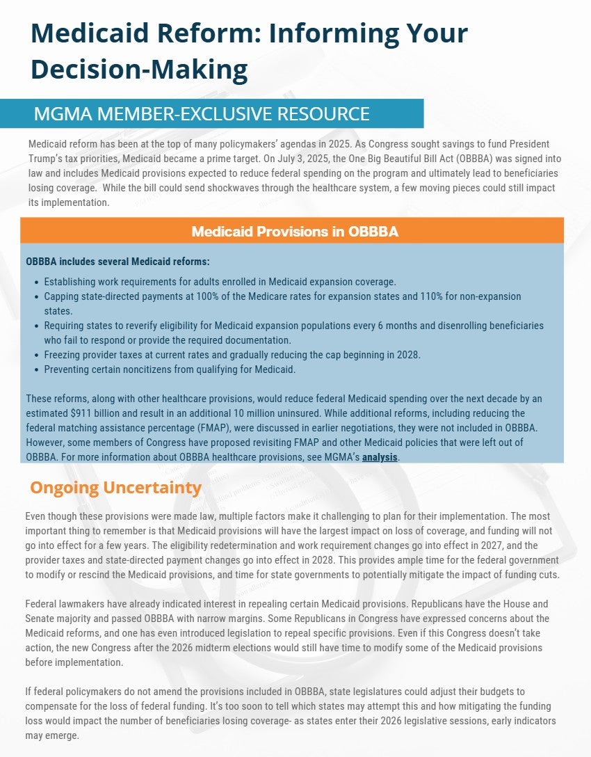 Medicaid reform has been at the top of many policymakers’ agendas in 2025. As Congress sought savings to fund President Trump’s tax priorities, Medicaid became a prime target. On July 3, 2025, the One Big Beautiful Bill Act (OBBBA) was signed into law and includes Medicaid provisions expected to reduce federal spending on the program and ultimately lead to beneficiaries losing coverage. While the bill could send shockwaves through the healthcare system, a few moving pieces could still impact its implementation.