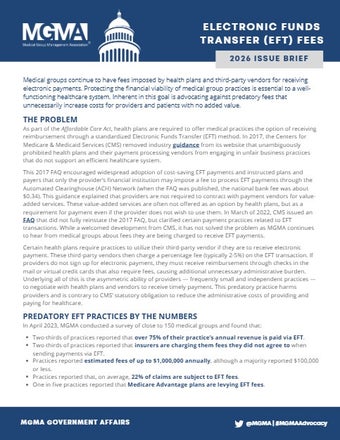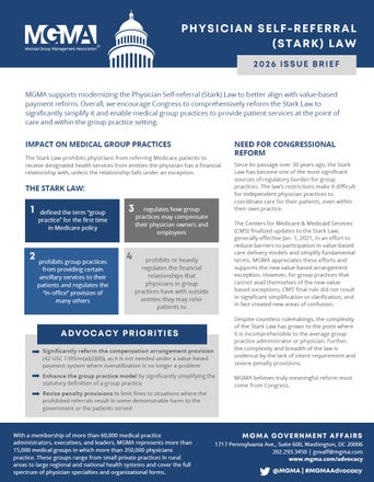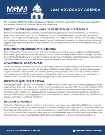 While certain Artificial Intelligence (AI) capabilities have long been around in the healthcare space, there has been a significant acceleration in the introduction and adoption of new AI technologies in recent years. This has led to increased congressional and regulatory consideration of how AI operates within the industry and how best to regulate its use. MGMA advocates for policies that bolster the development and utilization of effective and ethical AI tools to improve operational efficiencies for medical groups and support high-quality patient care.